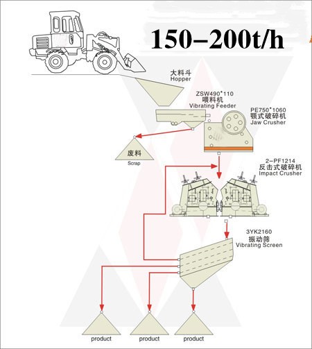 1. Este equipo de trituración de piedra se aplica principalmente a minerales y piedras de dureza media o alta, como granito, mineral de hierro, mármol, etc. Su capacidad puede ser de 150 a 200 toneladas por hora, y el tamaño final de los áridos puede ser de 0-10, 10-20, 20-30 o 30-40 mm (ajustable).